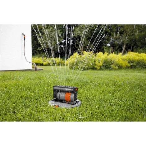 Das anschlussfertige Komplett-Set von der Marke Gardena ermöglicht den einfachen Einbau einer kompakten Bewässerungsanlage für quadratische und rechteckige Rasenflächen bis 140 m². Der Versenkregner wird unterirdisch installiert, hebt sich bei Wasserdurchfluss aus der Erde, bewässert zuverlässig und verschwindet anschließend wieder fast unsichtbar im Rasen. Dank eines Entwässerungsventils im Rohrverlauf ist die Anlage frostsicher und kann somit dauerhaft im Garten verbleiben. Die Sprengbreite reicht dabei von 1 m bis 9,5 m, die Wurfweite von 2 m bis 15 m. Der Wasserdurchfluss ist stufenlos regulierbar. Dank der variablen Einstellmöglichkeiten können deshalb auch Kleinstflächen und schmale Gartenbereiche bewässert werden. 16 flexible Präzisionsdüsen aus Weichkunststoff sorgen für gleichmäßige Wasserverteilung und ein feinmaschiger Schmutzfilter für störungsfreien Betrieb.