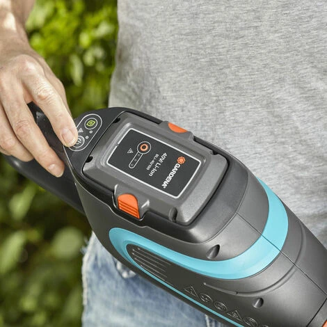 An einem intuitiven Tastenfeld am Griff kann der Ladezustand des Akkus abgelesen werden. Die Aktivierung des Eco-Modus für eine maximale Laufzeit der Heckenschere erfolgt per Knopfdruck.