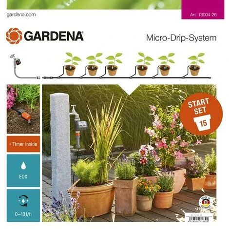 Der Startsatz für automatische Pots Gardena enthält alle erforderlichen Komponenten, um Wasser bei der Bewässerung von Töpfen auf Balkonen und Terrassen zu sparen.