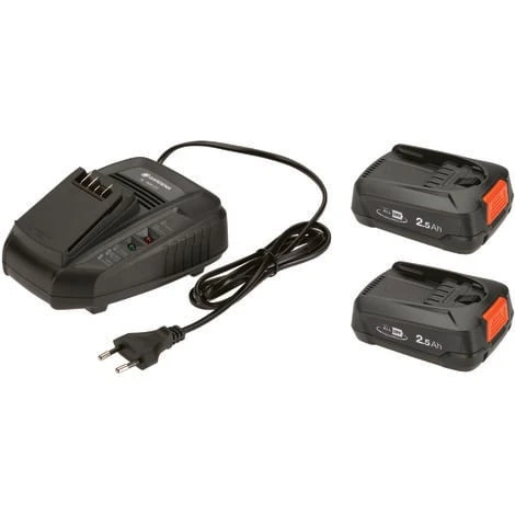 Betreiben aller 18V POWER FOR ALL Produkte mit dem 2,5Ah Akku PBA 18V/45 und diesen einfach wieder aufladen mit dem Schnell-Ladegerät AL 1830 CV von GARDENA. Beide sind in diesem Starter-Set enthalten, der 2,5Ah Akku sogar gleich zweimal. Es dauert nur 60 Minuten bis jeder der beiden 2,5Ah-Akkus komplett geladen ist. Während des Ladevorgangs, zeigt eine LED am Ladegerät den Ladezustand. Soll das Gerät schnell wieder einsatzbereit sein, ist es möglich den Akku auf 80% der Kapazität aufzuladen. Sobald die Ready to go-LED aufleuchtet, ist der Akku ausreichend geladen und kann wieder eingesetzt werden. Nach nur 40 Minuten ist ein 2,5Ah-Akku auf 80% geladen. Dieses Starter-Set passt perfekt zu allen GARDENA Rasenmähern und handgehaltenen Gartengeräten. Es ist ein Produkt der POWER FOR ALL ALLIANCE, eine der größten markenübergreifenden Akku-Allianzen weltweit. Der Akku ist einsetzbar in den verschiedensten Produkten der POWER FOR ALL ALLIANCE für rund um Haus und Garten.